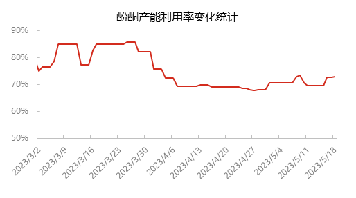 截止到5月18日当周,国内酚酮企业开工率正在70%的程度,环比消重1个百分点。近期盛虹炼化65万吨/年酚酮装备提拔至满负荷运作,广西华谊28万吨/年酚酮装备略有提负运作。